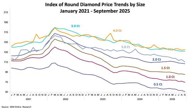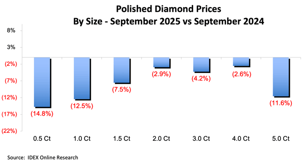 9月同比价格走势大体上与8月相仿,跌幅最大的仍是最小规格的商品(0.50克拉、1.0克拉)。2.0克拉至4.0克拉钻石的价格跌幅则较上月略有收窄。
