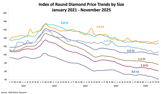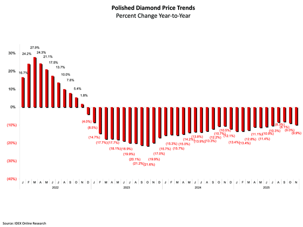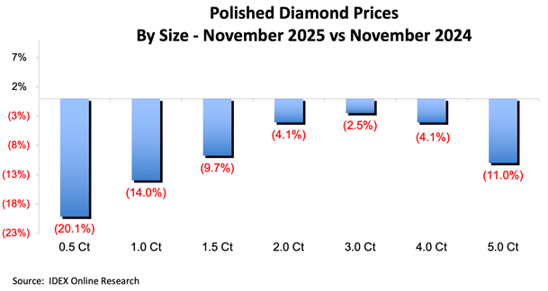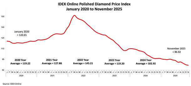 随着下行趋势持续,IDEX 成品钻石价格指数 11 月下跌 1.72%。